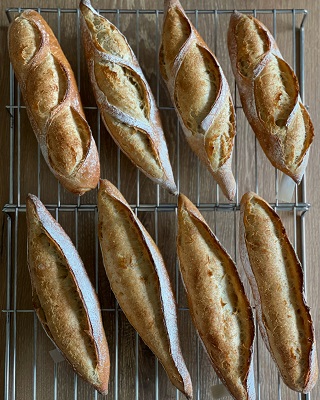 1月、2月のバゲットレッスンでは「レスペクチュス・パニス製法」で作るバゲットをご紹介いたします。ごく少量のイーストでじっくりと時間をかけて小麦粉本来の旨味や甘みを引き出すこの製法は、塩の使用量を減らしても物足りなさを感じることがなく大変香ばしく美味しいパンを作ることができます。また、酵素の働きでグルテンを弱めることで消化もよくなり、健康面でもこれから見逃せない製法です。基本の配合と、大麦入りの配合の2種類のバゲットをご用意いたします。家庭用オーブンでもクープが開きやすく、作りやすい製法です。